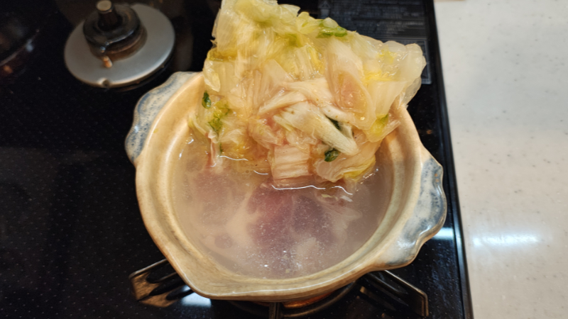 ちゃんとお鍋の中にすべての具材が入り切りますので慌てず待ちましょう。