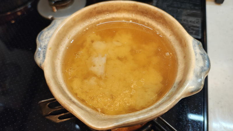 解凍しておいた出汁をお鍋に加えてひと煮立ちさせて完成です。
