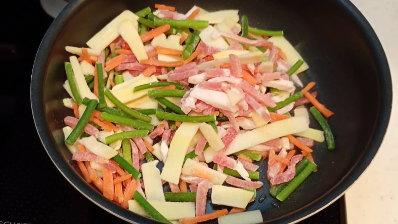 下準備ができたらセットの具材を炒めていきます。