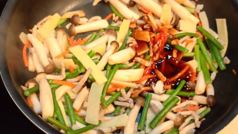 炒めたセットの具材にしめじを追加して更に炒めていきます。