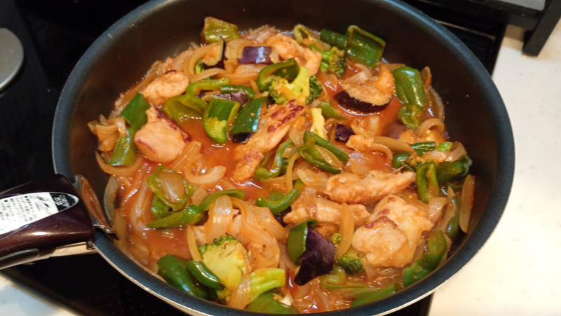 鶏肉に焼色が付いたり、玉ねぎ・ピーマンが柔らかくなってきたら