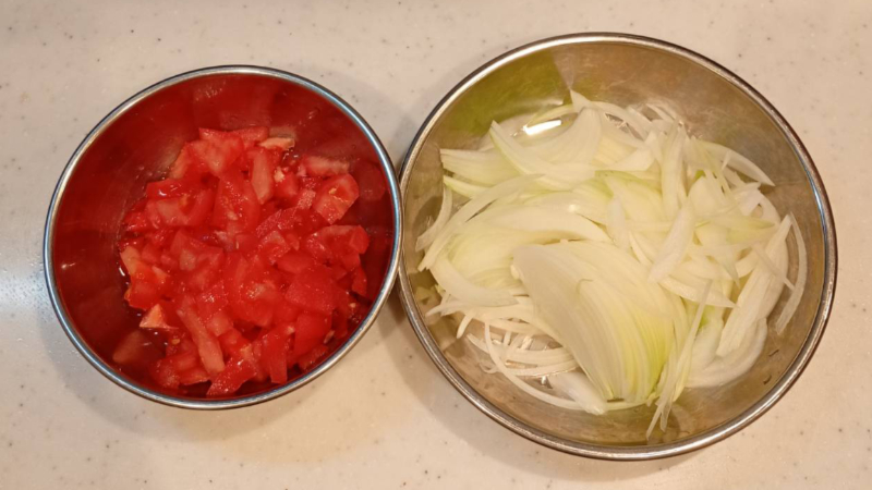 自宅で用意するトマトと玉ねぎをカットします。