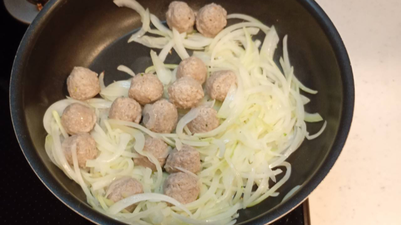 ミートボールと玉ねぎを炒める