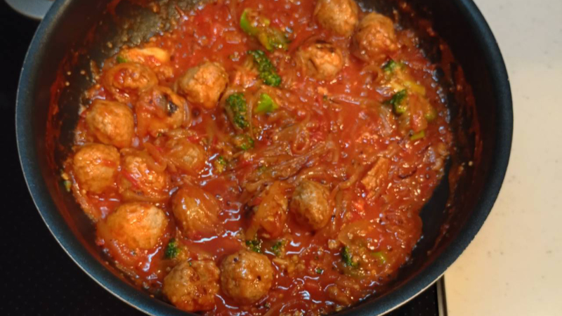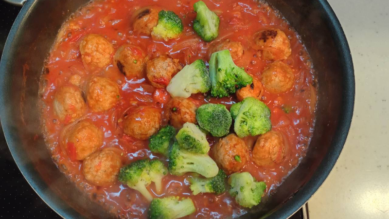 トマト・玉ねぎをぷらす ミートボールとブロッコリーの煮込み風