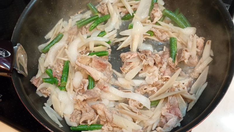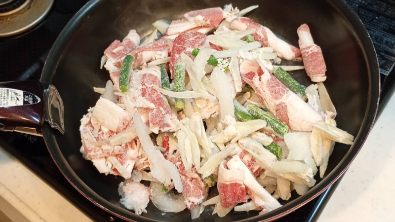 3分程度混ぜながら炒め、具材が解凍されて牛肉の色が変わり始めたら次の工程に進みます。