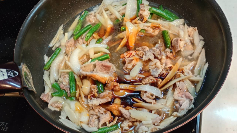 牛肉の色が写真のように変わったら火力をやや弱火にして蓋をして約2分程度蒸し焼きにします。