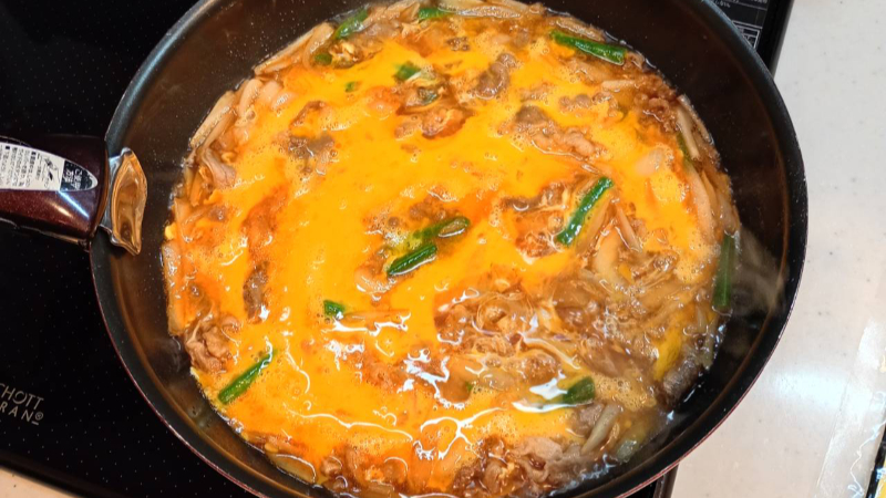 水分が沸騰し始めたら溶き卵(1セットにつき2個)をまわしかけます。