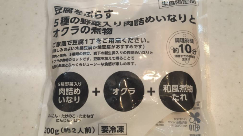 - 商品名:豆腐をぷらす 5種の野菜入り肉詰めいなりとオクラの煮物