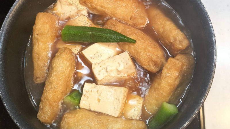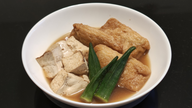 今回は「豆腐をぷらす 5種の野菜入り肉詰めいなりとオクラの煮物」